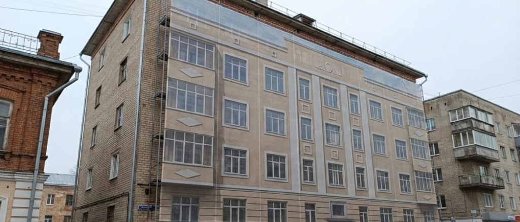 Строительная сетка с печатью закрывает фасад здания на период ремонта или реконструкции. Полотно крепится на строительные леса и скрывает рабочий процесс от прохожих.