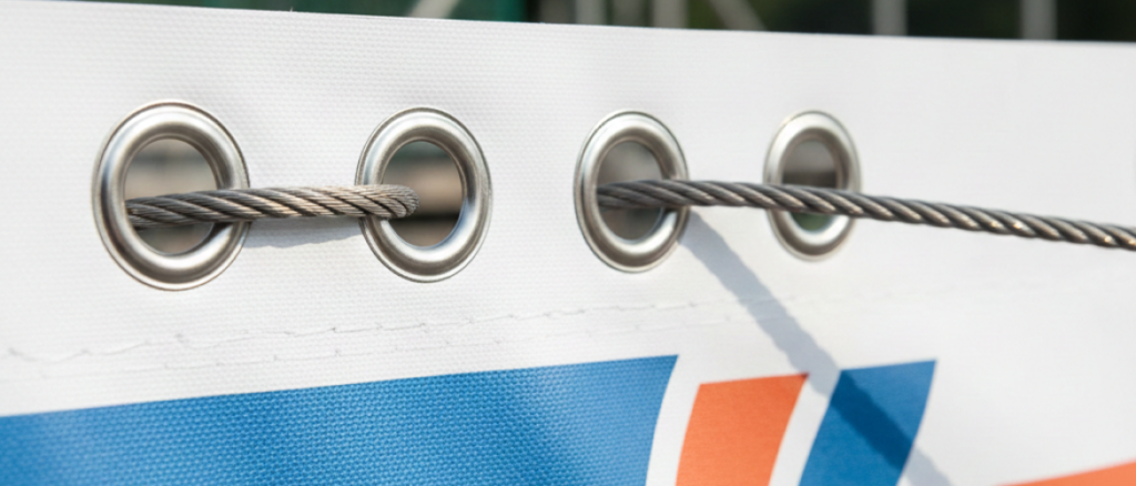 По периметру полотна устанавливаются люверсы с шагом 30–50 см. Сетка крепится на тросы, строительные леса или металлический каркас. Монтаж не требует специального оборудования.