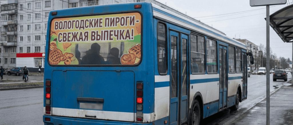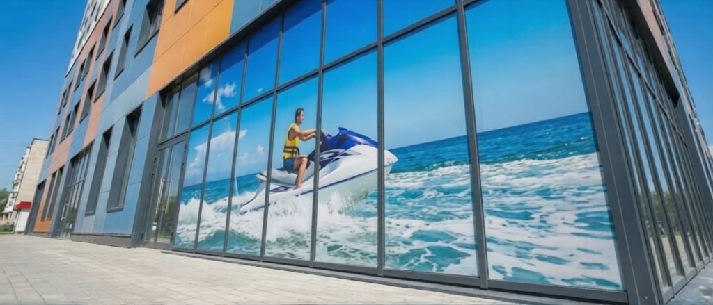 Перфорированная реклама использует стеклянные поверхности, которые уже есть у бизнеса — витрины магазинов, окна офисов, стёкла корпоративного транспорта. Не нужно арендовать билборды, согласовывать конструкции с городскими службами или платить за размещение ежемесячно. Затраты на изготовление и монтаж окупаются за счёт постоянной работы рекламного носителя. Ниже — два популярных варианта размещения.